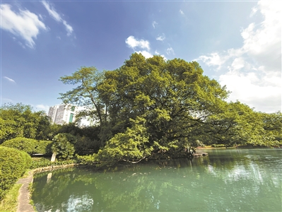 晓港公园桂影岛内的这棵百年黄葛树,树高十几米,远远就能被看见,树干倒影在周边的湖水上,更显苍劲葱绿,勃勃生机。