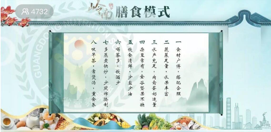 据悉,专家组通过总结岭南地区居民传统的饮食特点,并结合现代循证营养健康证据,凝练出涵盖八条特征的《岭南膳食模式》。具体为:1.食材广博,搭配合理;2.蔬菜足量,水果丰富;3.水产充足,肉禽蛋奶适量;4.杂豆常有,全谷坚果不缺;5.饮食清鲜,少盐少油;6.喝茶多,饮酒少;7.多蒸煮快炒,少煎炸腌制;8.叹早茶,常煲汤,重食养。