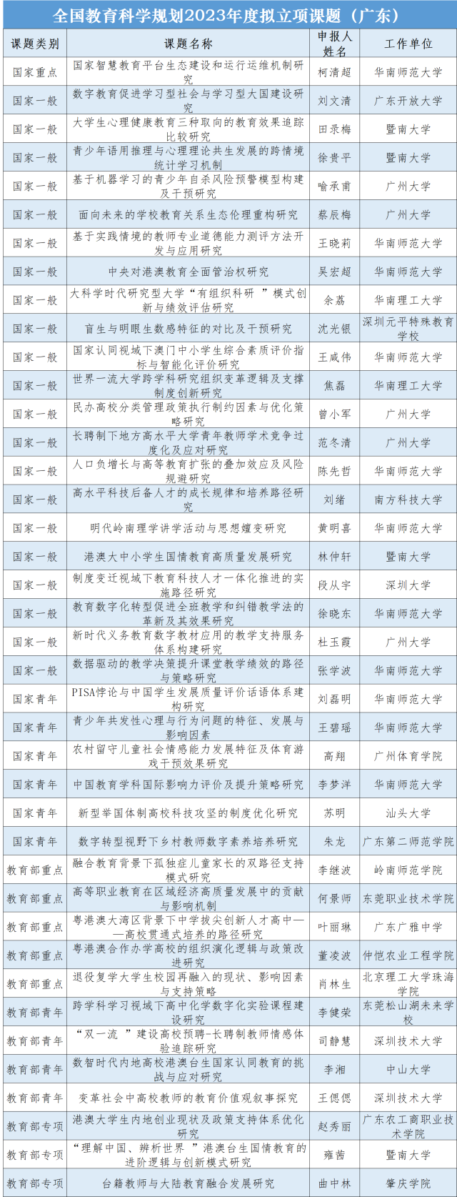 日前,全国教育科学规划领导小组办公室对外公示全国教育科学规划2023年度课题拟立项名单,全国拟立项课题524项。其中,广东拟立项课题40项,包括国家重点1项、国家一般21项、国家青年6项、教育部重点5项、教育部青年4项、教育部专项3项。