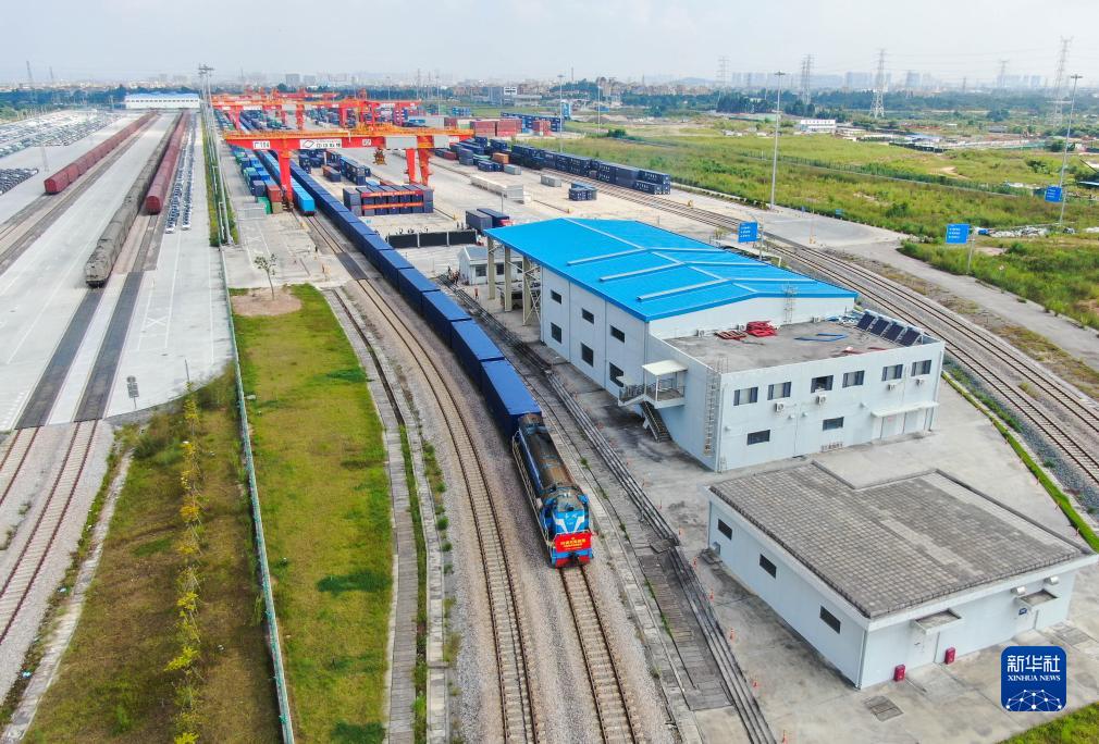 9月20日拍摄的广州国际港50英尺集装箱多联快车首发列车X802次货运列车。新华社记者 邓华 摄