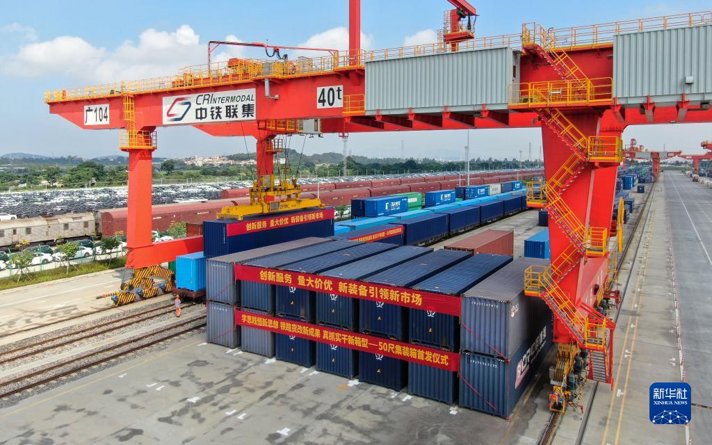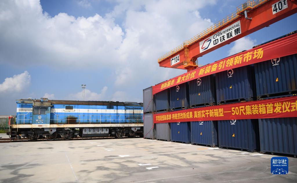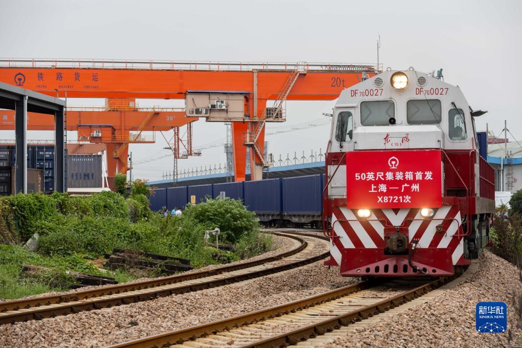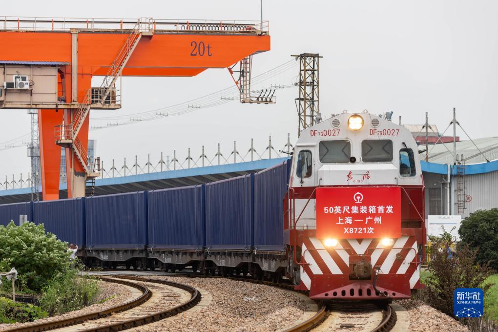 当日,搭载50英尺集装箱的铁路多联快车分别从上海闵行站、广州国际港站、长沙北站、昆明王家营西站始发,将常态化投入铁路货物运输。据了解,50英尺集装箱由国铁集团自主研发,箱体总重36吨,载重30.85吨,容积达114.4立方米,比40英尺国际标准箱容积增加50%,是目前国内容积最大的集装箱,满足铁路货物列车装载和运输安全要求,并经过了上线测试和安全评估。