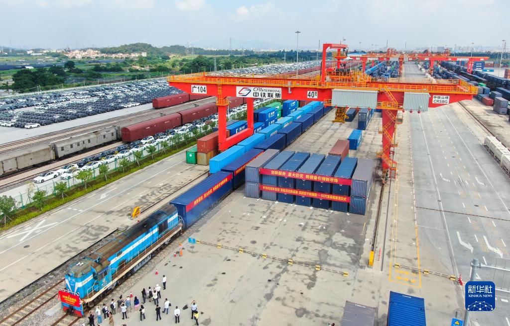 9月20日,在广州国际港,起重机将50英尺集装箱吊运到货运列车上(无人机照片)。新华社记者 邓华 摄