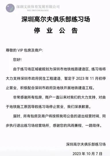 奥一新闻留意到,10月7日,深圳高尔夫俱乐部练习场发布公告称,由于练习场区域被规划为深圳市地铁线路建造区,练习场将大力支持深圳市政府民生工程建造,暂定于2023年11月初停止营业。届时,所有包房及商户将按公告的退出经营时间,同步执行退出练习场经营场所。至于公众关心的70栋别墅结局,该公告未提及。