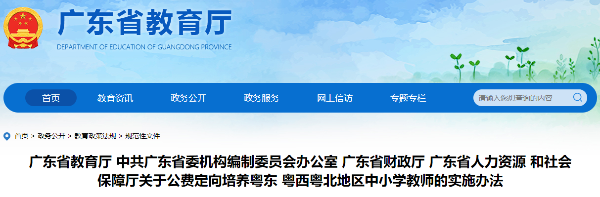 《关于公费定向培养粤东粤西粤北地区中小学教师的实施办法》。图片来源:广东省教育厅官方网站