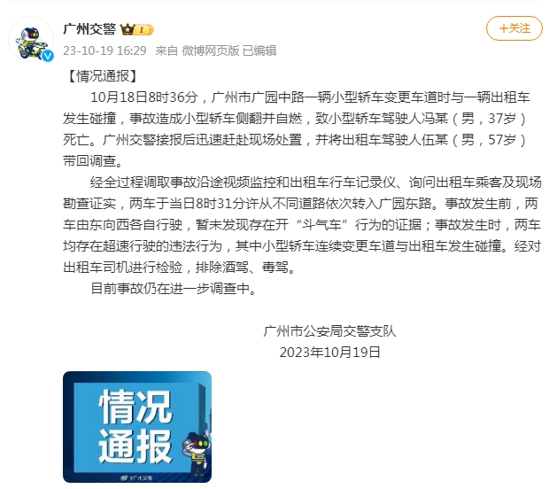 10月19日,广州交警通报广州市广园中路一辆小型轿车变更车道时与一辆出租车发生碰撞,事故造成小型轿车侧翻并自燃,致小型轿车驾驶人冯某(男,37岁)死亡。