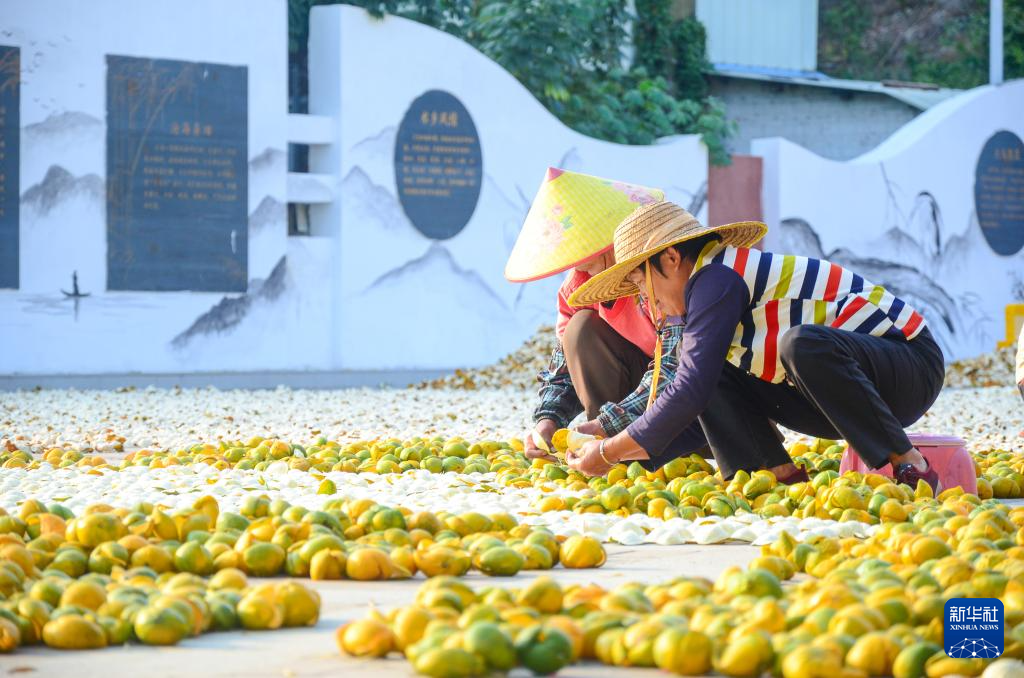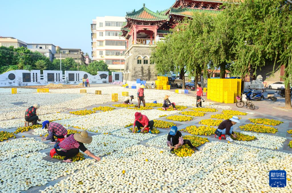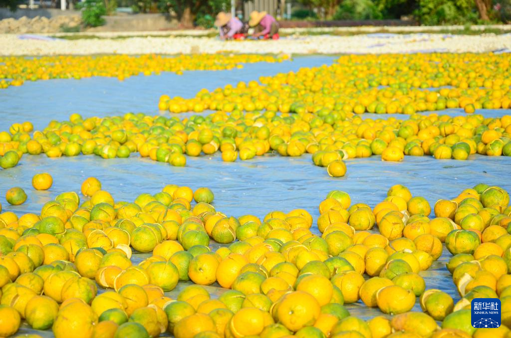 连日来,广东省江门市天气晴好,新会区果农把握有利时机,抓紧晾晒柑果果皮。新会柑经开皮、晒制、陈化等程序后可制成新会陈皮。新华社发(关煜柔 摄)