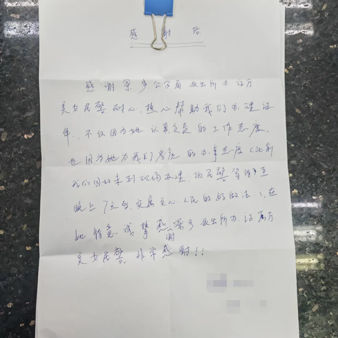 当日,为尽快帮助夫妇解决困难,石晓芹主动舍弃休息时间通过周到的协商沟通,于次日办结完毕所有手续,解了夫妇的心结。为感谢派出所在最短时间内,为其办妥业务,助解困忧,夫妇俩寄送来一封手写感谢信,并在“平安厅”信箱留言点赞。