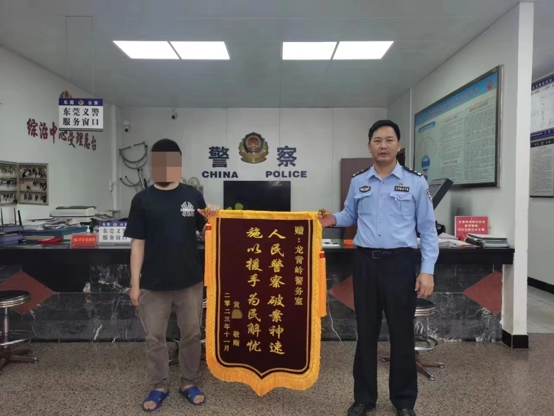 11月7日,黄先生带着锦旗到龙背岭警务室送给警务室,并表示警务室工作人员尽心为民,破案神速,表示对人民公安为民尽心尽责,非常满意。