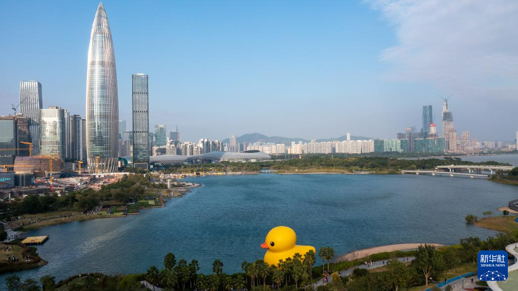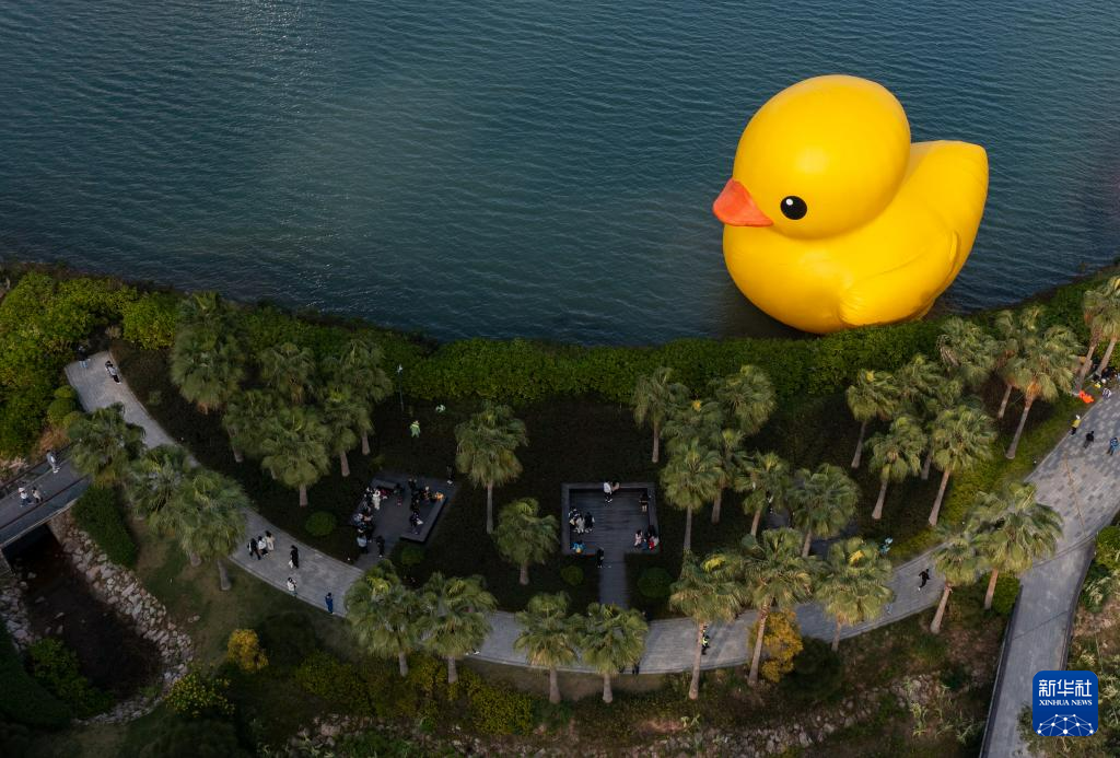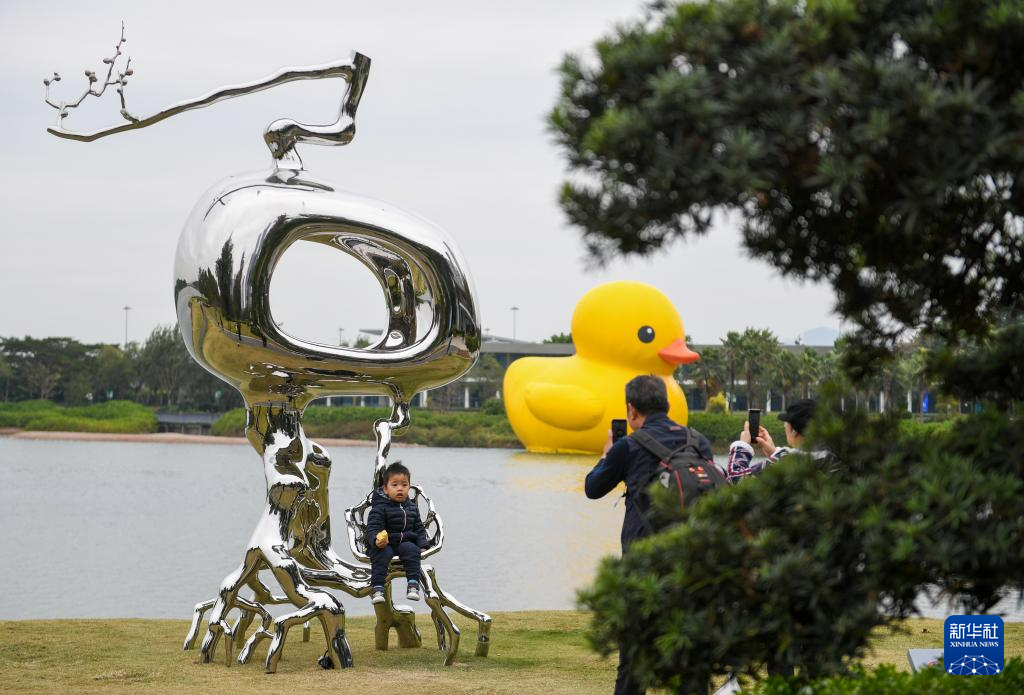 当日,2023深圳湾公共艺术季在深圳人才公园开幕,包括“大黄鸭”在内的12件出自国内外艺术家之手的雕塑和装置作品在该公园向公众展出。