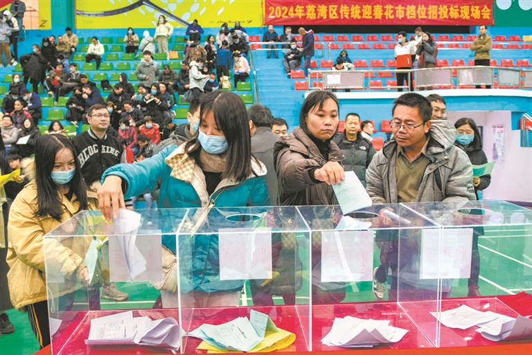 荔湾区花市办工作人员吴涛介绍,通过梳理往年花市档主信息、精准投放招投标通知,借助媒体宣传以及发动花卉市场、经济联社动员等方式,当天的招投标现场人气十足,其中,门槛较低的工艺品档竞争最为激烈,竞标人与档位数之比达2:1。