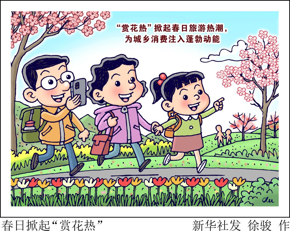 长安街上玉兰婀娜多姿,千年古寺丁香芳姿初展,东湖之畔樱花灿若云霞,广西南宁黄花风铃木恣意绽放……春风拂过,全国各地繁花似锦。人们纷纷走进公园、郊野踏青赏花,“赏花热”掀起春日旅游热潮,为城乡消费注入蓬勃动能。新华社发 徐骏 作