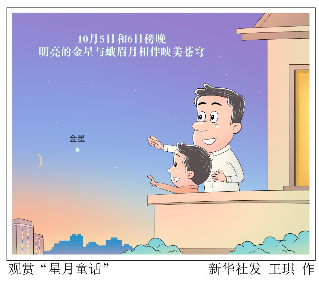 10月5日和6日傍晚,我国公众将有机会目睹明亮的金星与蛾眉月相伴的一幕“星月童话”。届时只要天气晴好,在西南方低空,星光与月光交织在一起,映美苍穹,成为天边一道亮丽的风景线。
