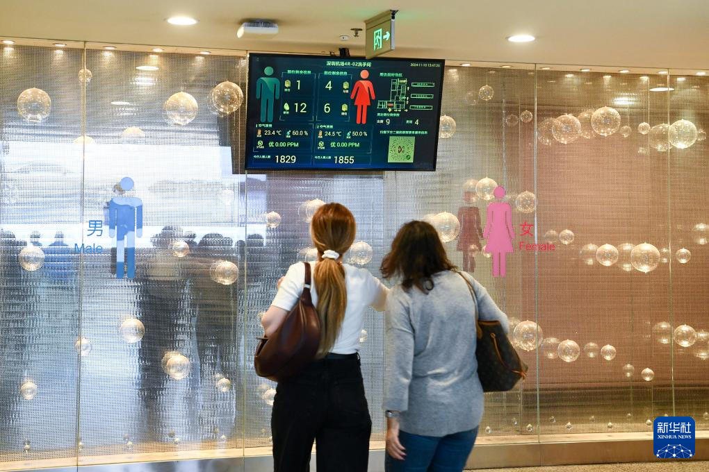 这是11月10日在深圳机场拍摄的智慧导厕系统。人们可以在厕所门口的大屏幕上实时查看厕位空余情况,以及周边公共厕所信息。新华社记者 梁旭 摄