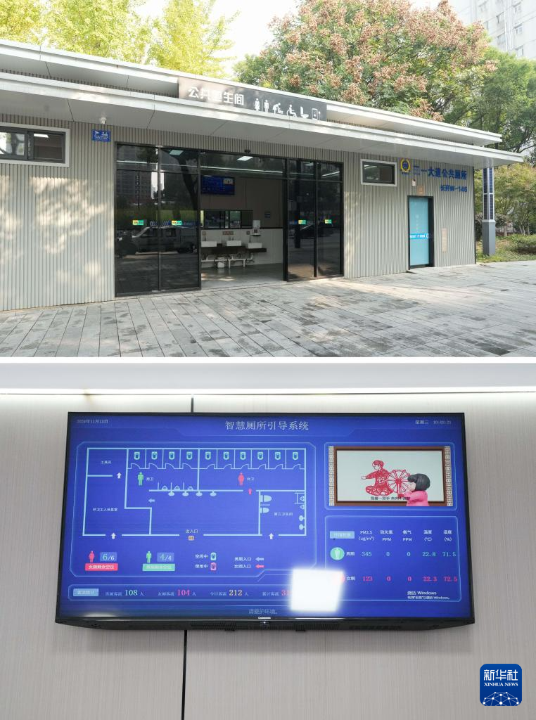 上图为长沙市三一大道公共卫生间;下图为三一大道公共卫生间内设置的智慧厕所引导系统(11月13日摄,拼版照片)。这个公共卫生间提高了女性厕位比例,卫生间内设置的智慧厕所引导系统能显示卫生间内的繁忙程度。新华社记者 薛宇舸 摄