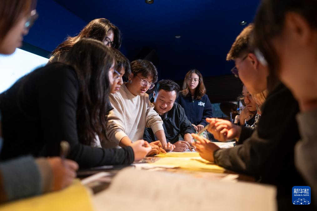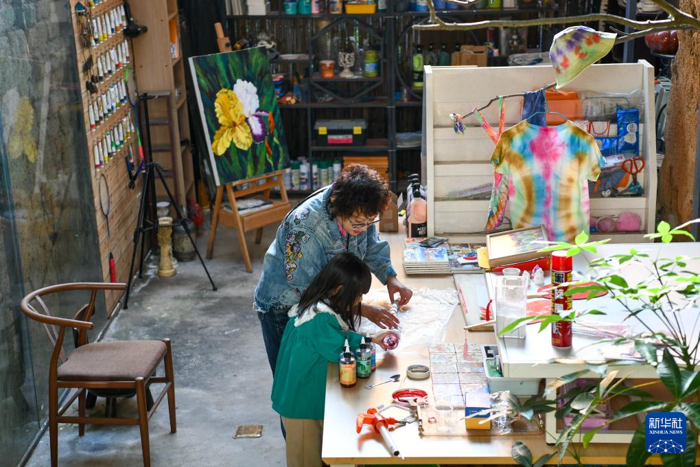 12月13日,在上围村花镜园工作室,艺术家刘静静在指导小朋友进行扎染创作。新华社记者 梁旭 摄