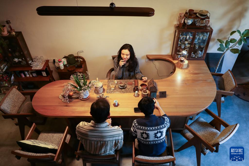 12月13日,在上围村鱼里茶空间,主理人黄煜(左)为客人泡茶。新华社记者 伍志尊 摄
