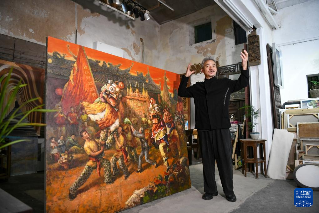 12月13日,在上围村幽兰坊工作室,艺术家唐文标为游客讲解根据广东非遗舞麒麟创作的油画。新华社记者 梁旭 摄