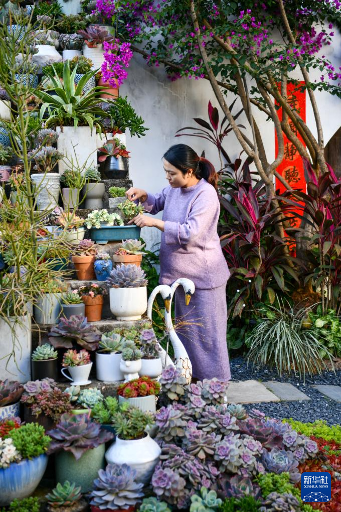 12月13日,在上围村花镜园工作室,主理人万慰在打理多肉植物。新华社记者 梁旭 摄