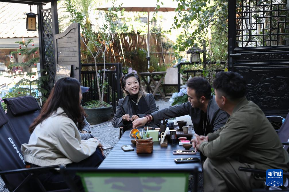 12月13日,上围村云顶小院工作室主理人王涛(左一)、高飞(右一)与邻居们在小院里喝茶。新华社记者 伍志尊 摄