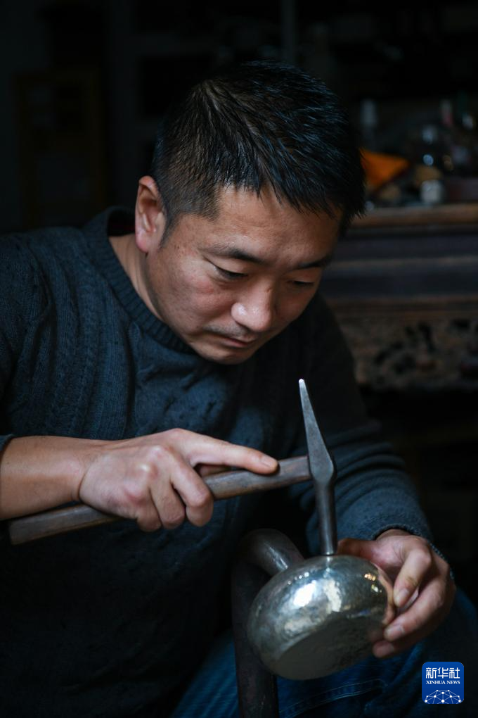 12月13日,在上围村本尧堂工作室,主理人陈荣鸽在打制银壶。新华社记者 梁旭 摄