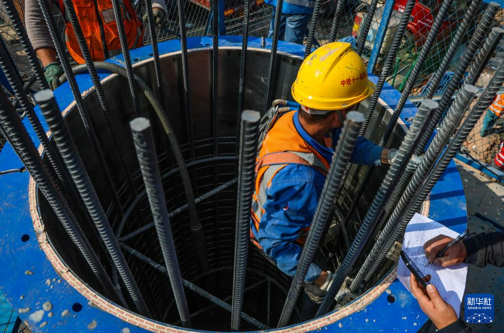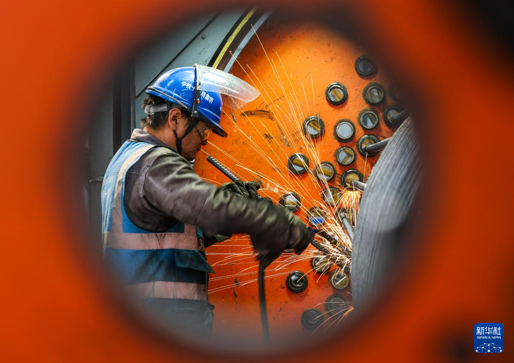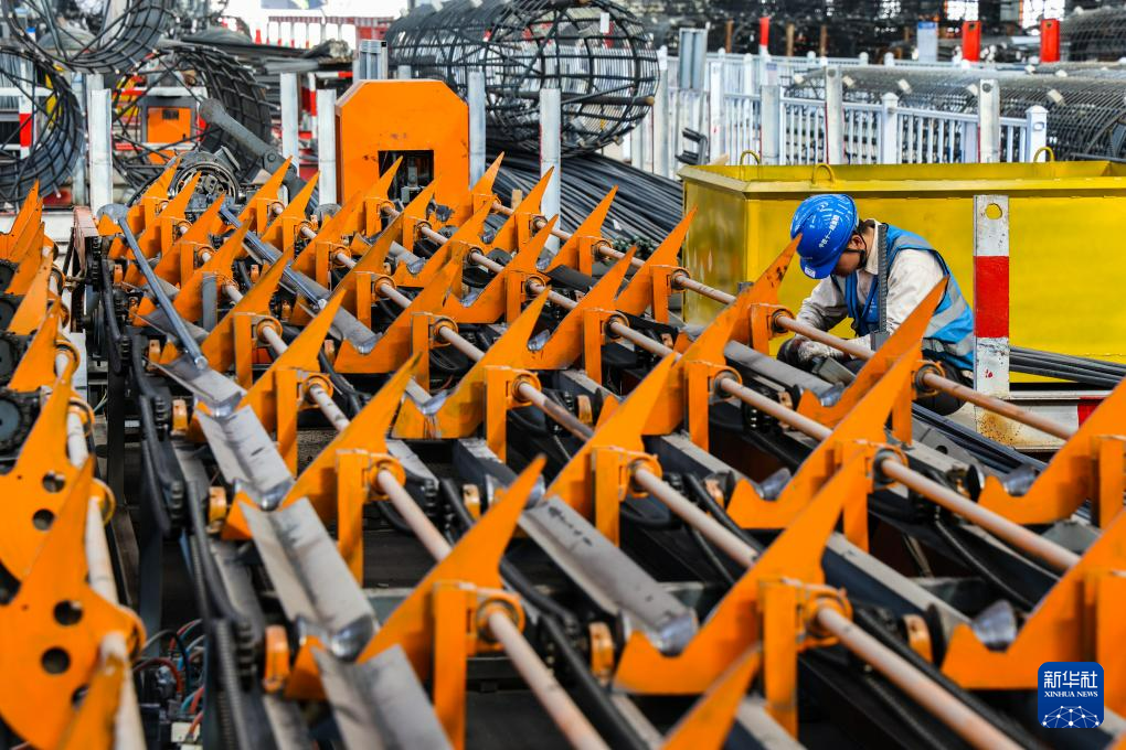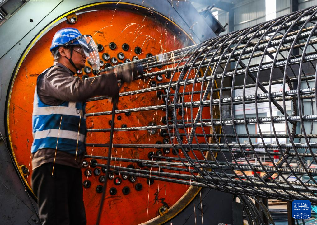1月9日,工人在广州北二环改扩建工程6标钢筋加工场焊接墩柱钢筋笼。