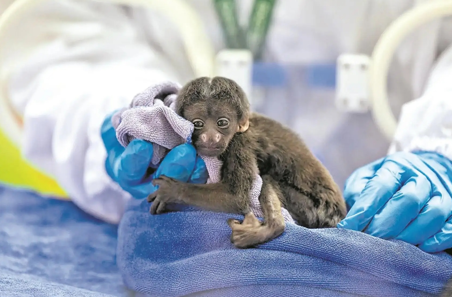 据长隆保育员阚涛介绍,此次新生幼崽的诞生充满惊险。幼崽出生后不久,猴群中的一只公猴突然抢夺幼崽,导致母婴被迫分离,幼崽无法正常吮吸母乳。为确保幼猴存活,保育团队经过商议,当机立断启动“人工育幼”预案,24小时轮班照料,模拟母猴喂养行为,以专用配方奶粉和保温设备维持其健康。