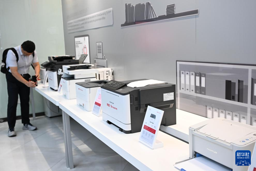 4月29日,参观者在珠海纳思达股份有限公司拍摄奔图打印机系列产品。