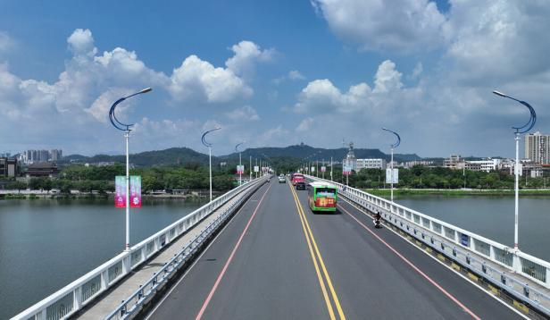 8月1日,第十五届全国运动会开幕式迎来倒计时100天。惠州城市街道到处可见有关十五运会的宣传标语和海报,全运元素已融入惠州城市肌理。(惠州大桥)