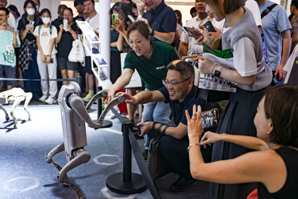 图为参观者在2025世界人工智能大会展览现场和一款机器狗互动(7月29日,新华社记者陈浩明 摄)