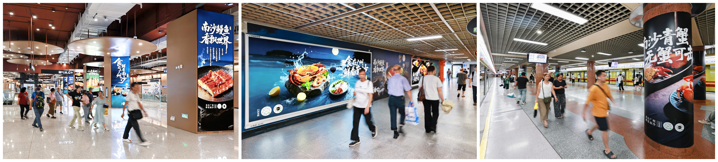 目前,南沙拥有现代渔业产业园和30余家青蟹科研、养殖、销售相关企业,形成了较为完整的产业链。南沙水产正以前所未有的姿态走向全球,在这月圆人团圆的美好时节,为餐桌增添了一抹浓郁的岭南风味。中秋佳节来临之际,在广州地铁1号线公园前主题通道1、1号线东山口站厅包柱、12号线二沙岛自组站厅包柱上均可以看到南沙水产的广告,覆盖1120万客流量。