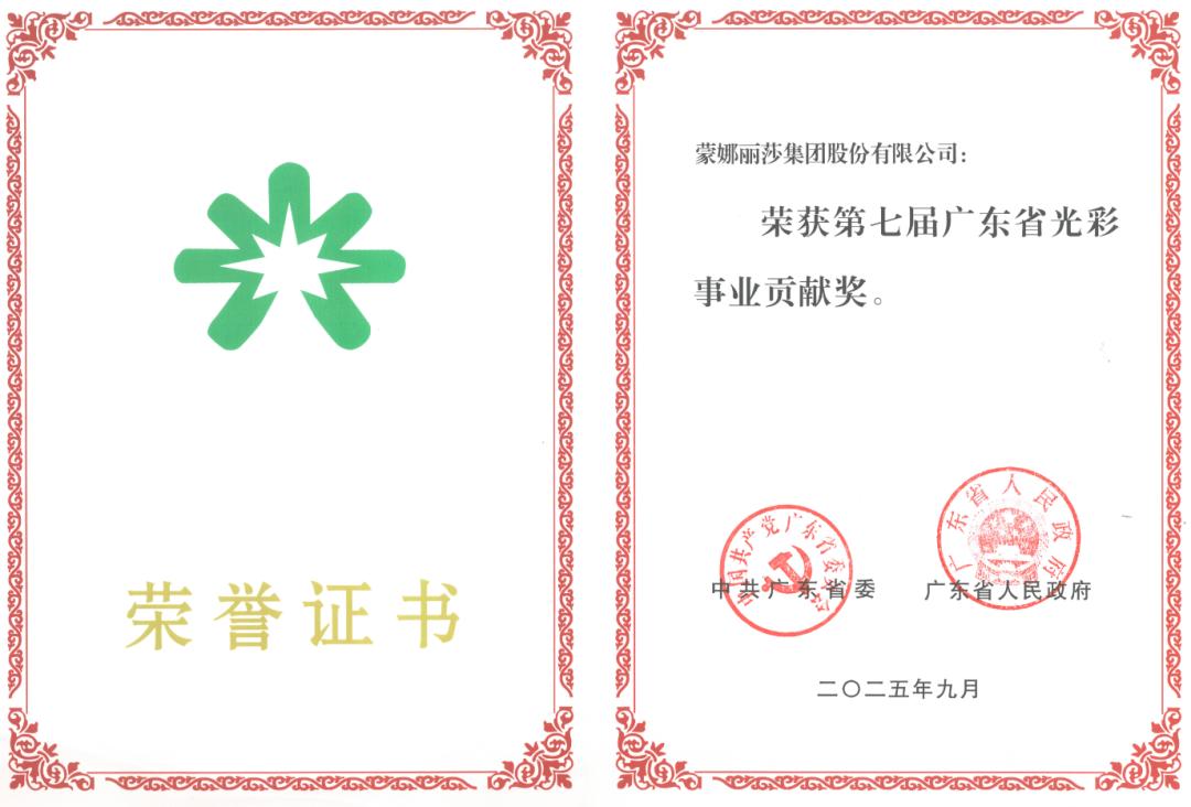 9月29日,以“粤联四海 商创未来”为主题的2025世界粤商大会在广州举行。蒙娜丽莎集团凭借技术创新的深耕和社会责任的长期践行,获颁“广东省光彩事业贡献奖”。