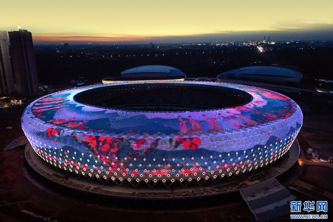 9月30日,茂名奥林匹克体育中心亮灯。新华网发 (陈柏冲 摄)