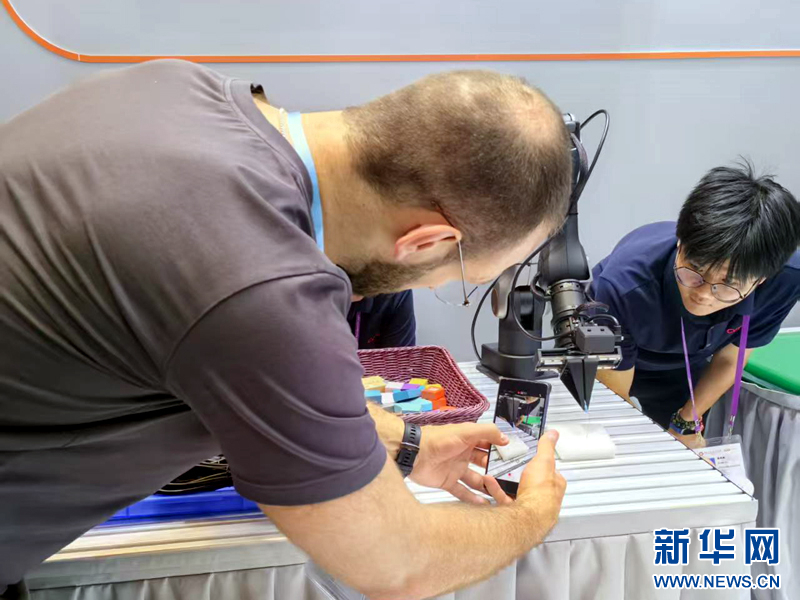 2025年10月15日,一位采购商在视源股份展台拍摄能“毫米级穿针引线”的机械臂。新华网 卢鉴 摄