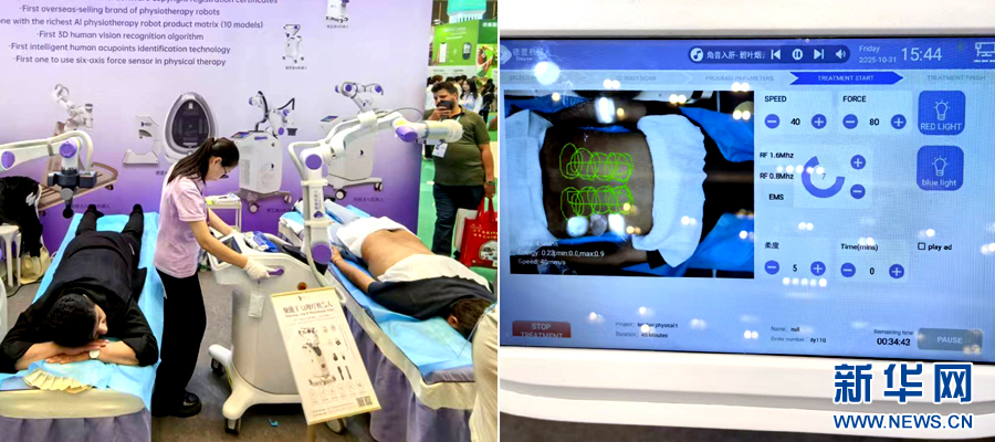 2025年10月31日,138届广交会上,采购商体验AI理疗机器人和AI机器人筋膜仪。新华网 卢鉴 摄
