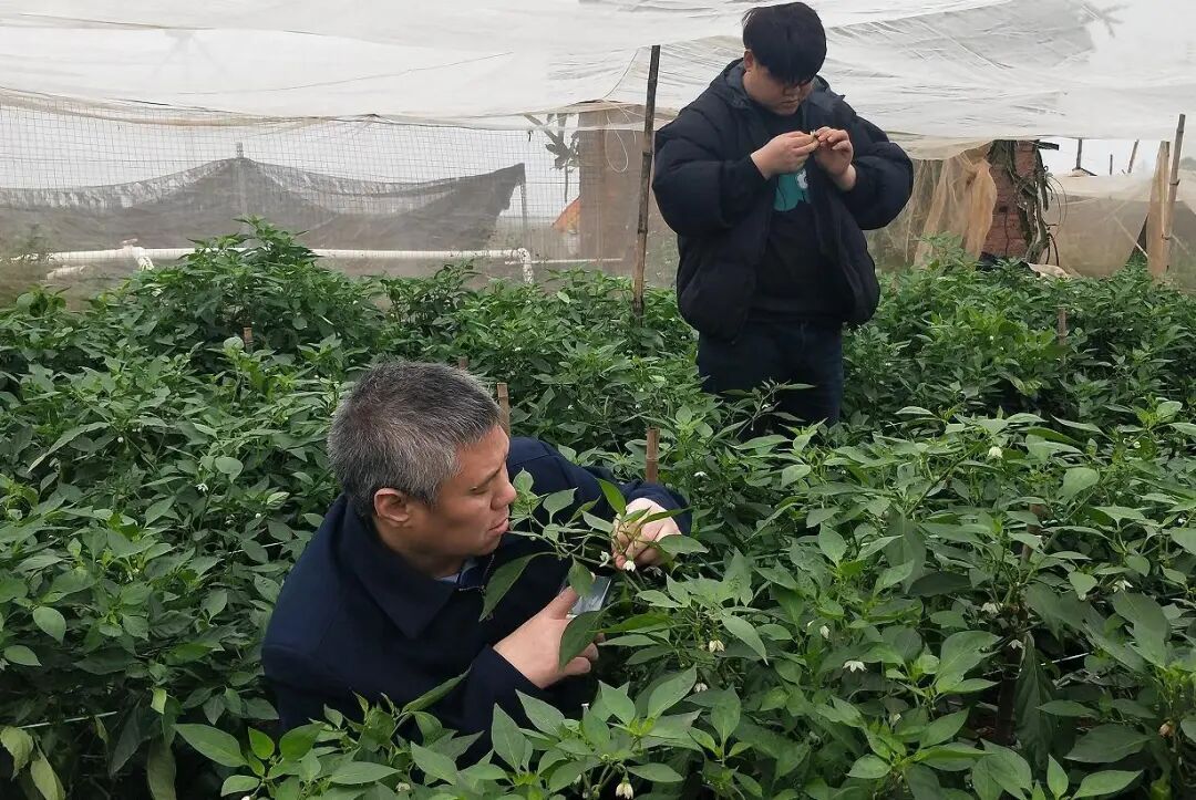 图片华南农大教授张志祥与博士生在辣椒示范园开展蓟马防控实验