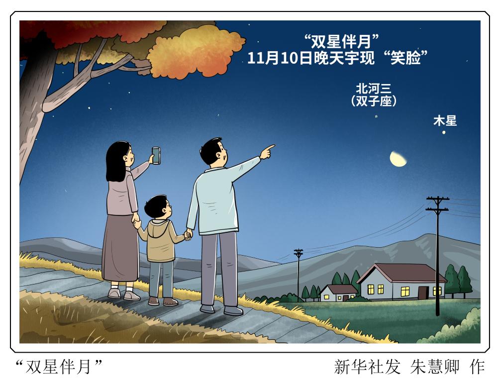 当行星、恒星和月球这三个不同类型的天体“欢聚”在同一片天区,会擦出怎样的火花?机会来了。11月10日晚,木星和双子座中最亮的恒星北河三将会与一轮亏凸月联袂上演一出“双星伴月”的好戏,三者届时还会在天空中组成一张“笑脸”的样子。