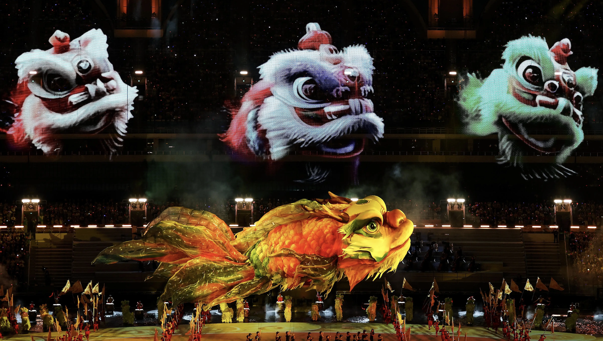 开幕式上,醒狮、鳌鱼等岭南元素震撼人心。图/新华社