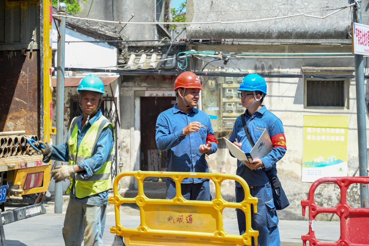 揭阳榕城局党员突击队对揭阳古城电力改造施工现场进行协调监督工作。(林泽锐 摄)