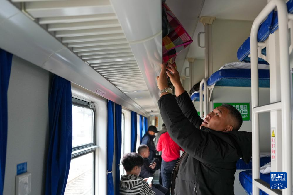 1月25日,在广州火车站,旅客在K303次列车上摆放行李。