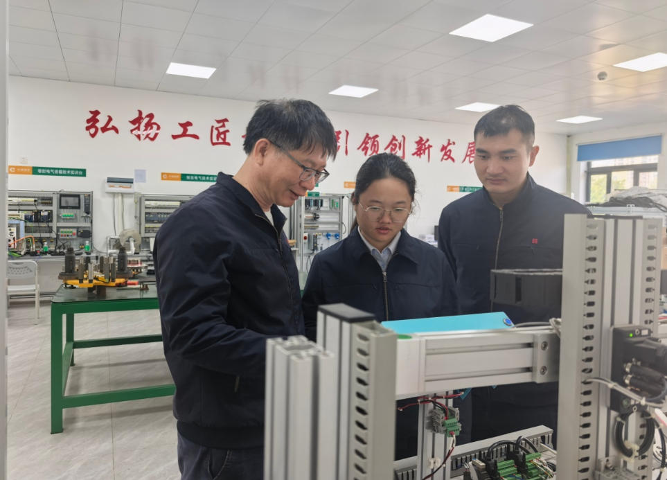 工匠创新工作室领衔人李继波对莫冬炎开展指导。(广东中烟 供图)