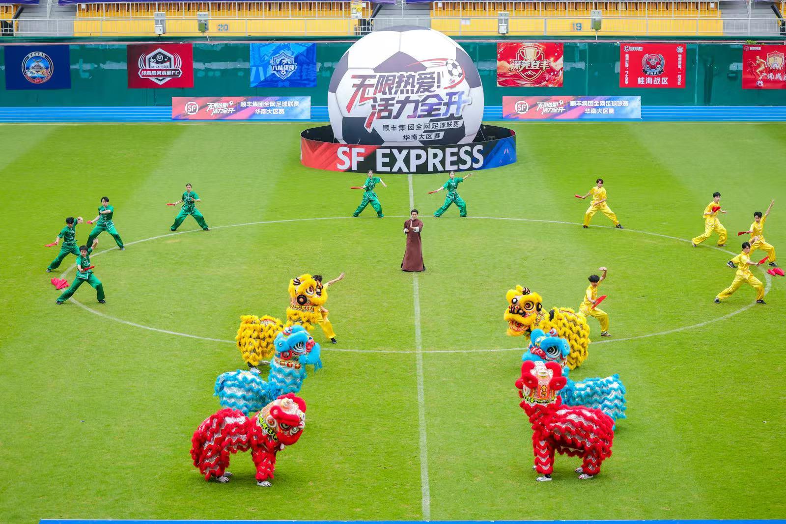 3月21日,顺丰集团全网足球联赛华南大区赛在广州越秀山体育场开幕。本次赛事以“无限热爱,活力全开”为主题,将岭南文化、华南特色民俗与企业体育精神深度融合,来自华南不同区域的15支代表队、数百名顺丰健儿齐聚绿茵场,展现物流从业者的昂扬风貌。开幕式上,“岭南非遗醒狮+咏春”节目惊艳亮相。醒狮腾跃气势如虹,咏春拳刚柔并济,传统武术与民俗文化碰撞出强烈的视觉冲击,将岭南文化的厚重底蕴深植绿茵场,赢得全场阵阵掌声。