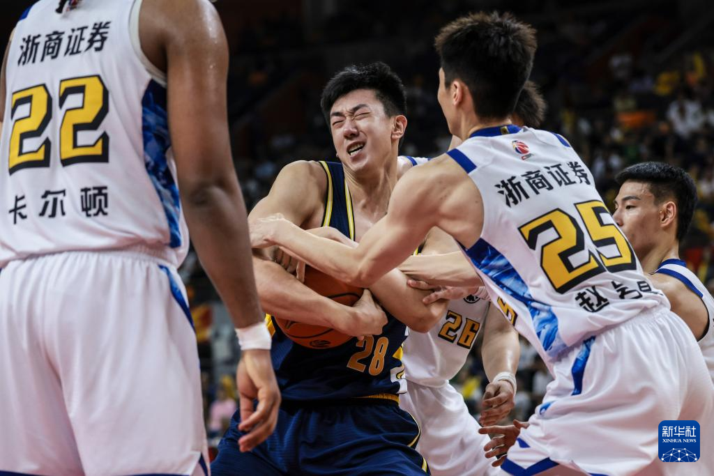 4月4日,浙江政商证券队球员胡金秋(中)在比赛中上篮。新华社发(郑家雄摄)