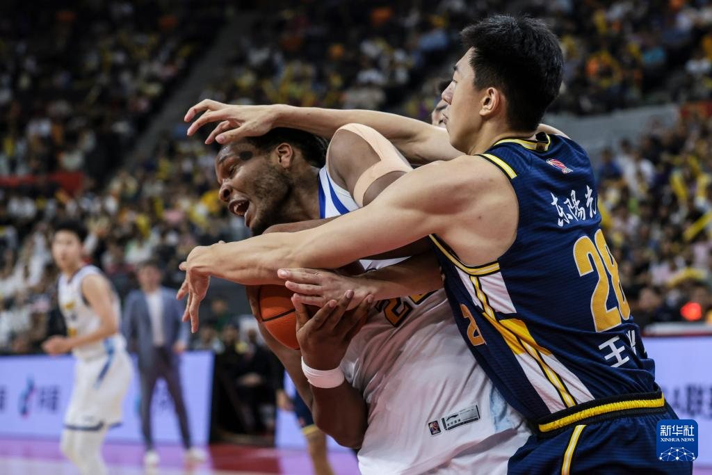 4月4日,广东东阳光队球员王少杰(中)在比赛中拼抢。新华社发(郑家雄摄)