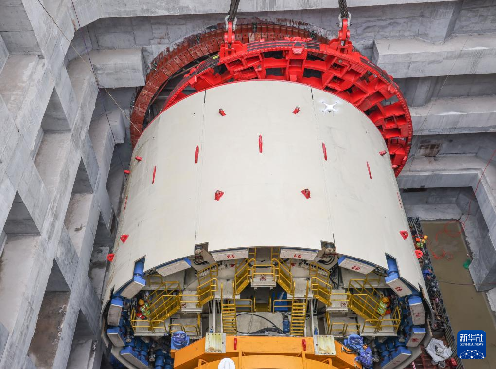 2月28日,重达330吨的“鲲鹏号”盾构机刀盘被吊进盾构井。