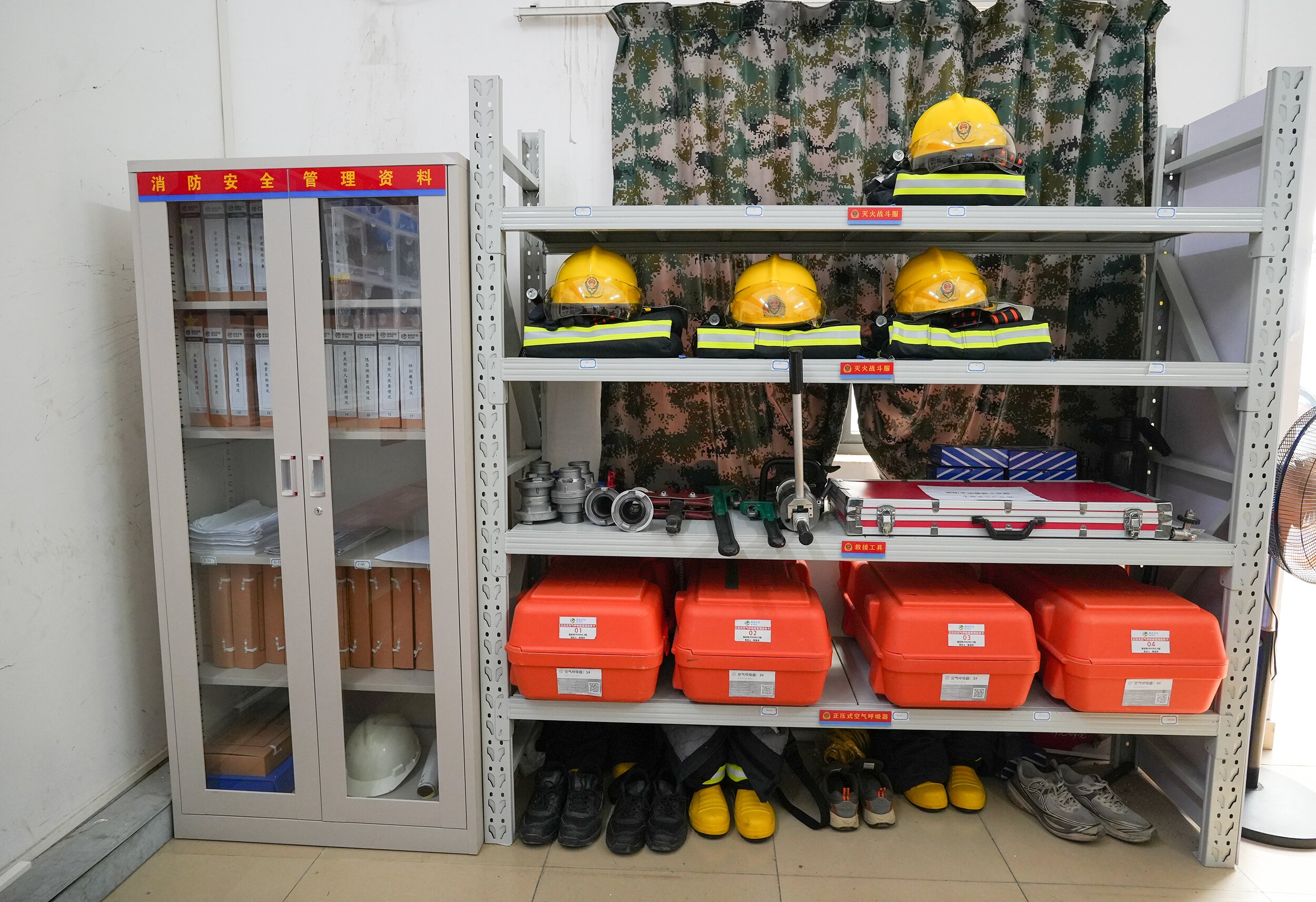 粤西农批消防控制室内,监控系统和火灾自动报警设备正实时运作,这是市场消防救援工作的中枢。旁边,灭火防护服、灭火器、逃生面罩、水带等消防设备一应俱全。