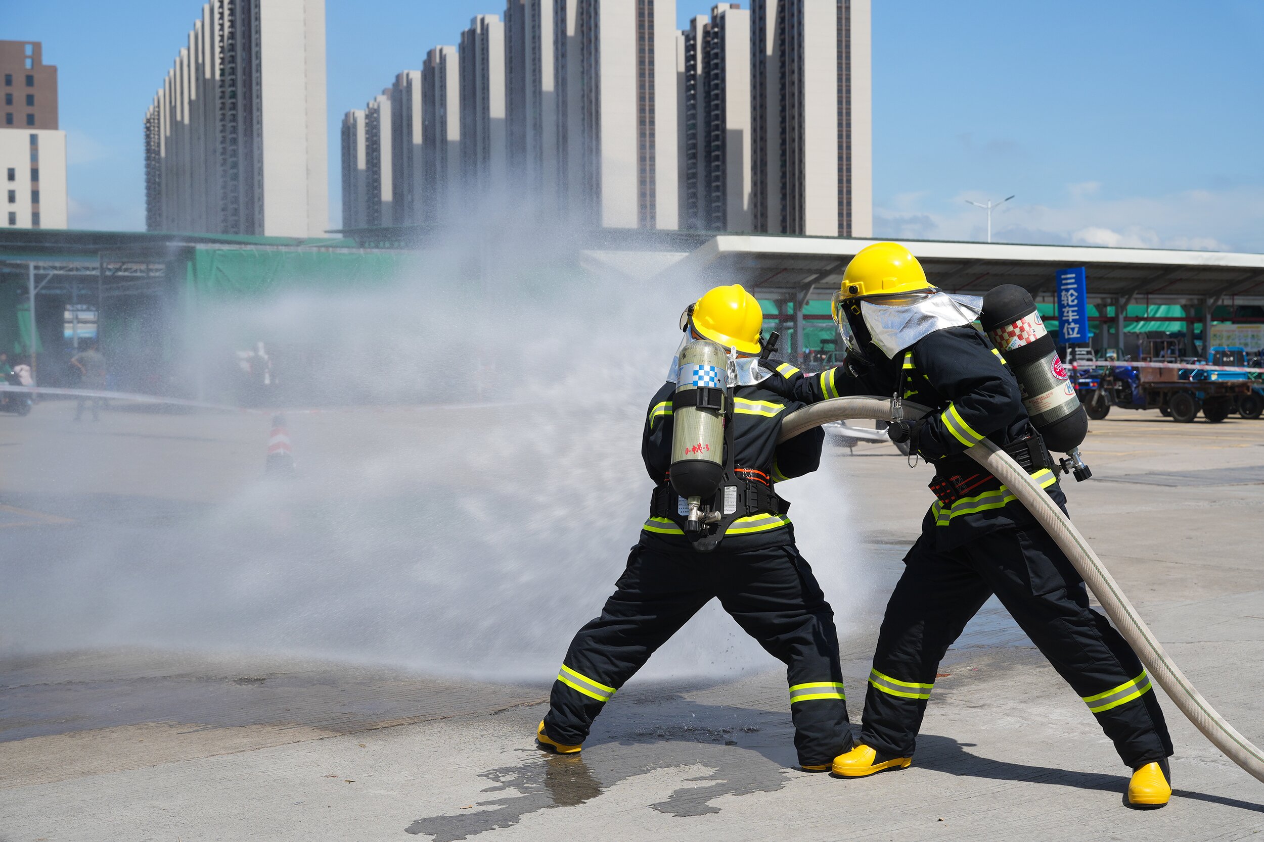 8月22日下午,位于茂名市电白区的粤西农副产品综合交易中心(以下简称粤西农批)一处位置“突发火情”。约一分钟后,3名消防人员驾驶消防车赶到现场。随着水枪喷出水雾,火情很快被扑灭......这是一场消防救援演练,消防人员、消防车等均隶属于粤西农批管理方建立的专职消防队。