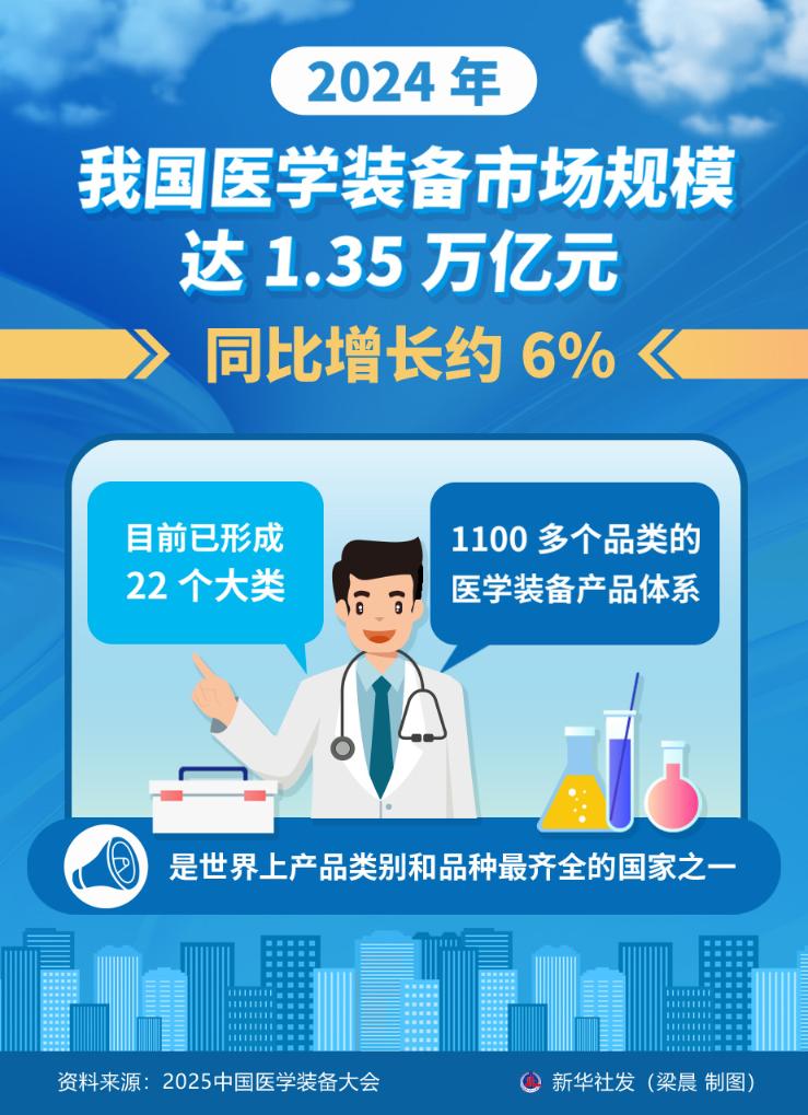 2024年,我国医学装备市场规模达1.35万亿元,同比增长约6%;目前已形成22个大类、1100多个品类的医学装备产品体系,是世界上产品类别和品种最齐全的国家之一……3月15日,2025中国医学装备大会在重庆开幕,大会公布数据显示,近年来我国医学装备市场规模持续扩大。