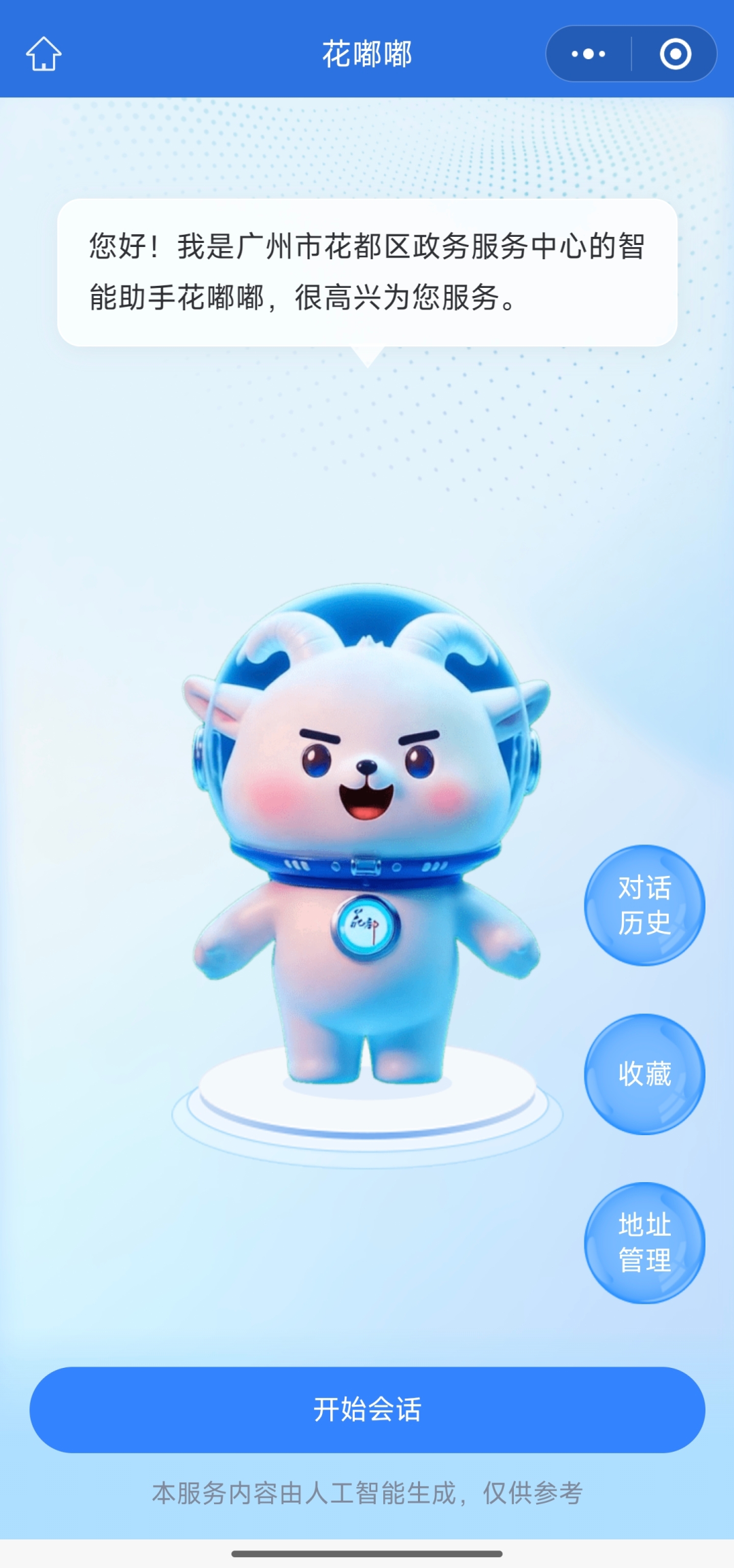打开“花好办”微信公众号,点击“AI政务”专区,登陆后即可看见活泼可爱的“花嘟嘟”对话框,您在办事中有任何疑问都可以咨询。目前专区已上线公安、人社等高频事项的咨询导办,下一步还将实现表格填写、材料准备、材料打印、签字提醒、柜机投递等功能,将真正实现从咨询到办件的一站式闭环体验。此外,该专区还可以通过预约时段推荐、AR导航指引等环节引导申请人实现智能预约、就近办。