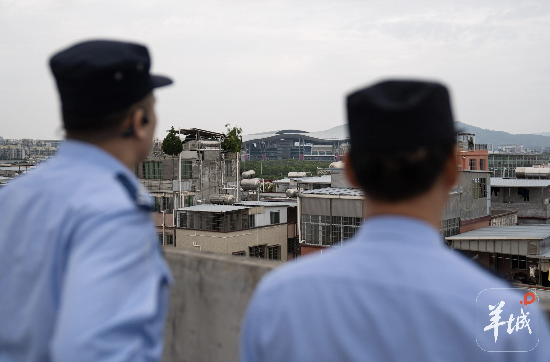 黄村派出所警力在城中村楼顶执勤,观察空中有无“黑飞”无人机,不远处就是开幕式会场。