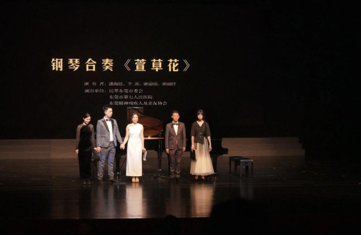 值得一提的是,东莞市第七人民医院的医患组合首次登上玉兰大剧院舞台。该院党委书记潘海恩与少儿心理科住院患友小Y(化名)四手联弹《萱草花》,精神康复科七位患友参与合唱《夜空中最亮的星》。他们的表演虽非专业水准,却饱含生命的真挚与力量,赢得全场经久不息的掌声。